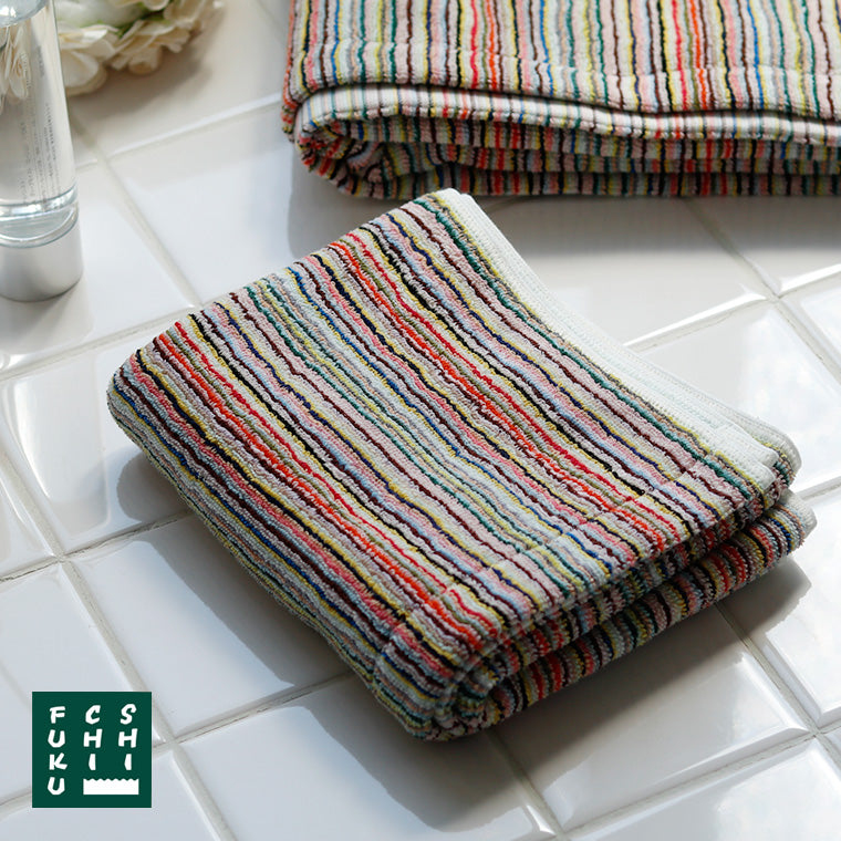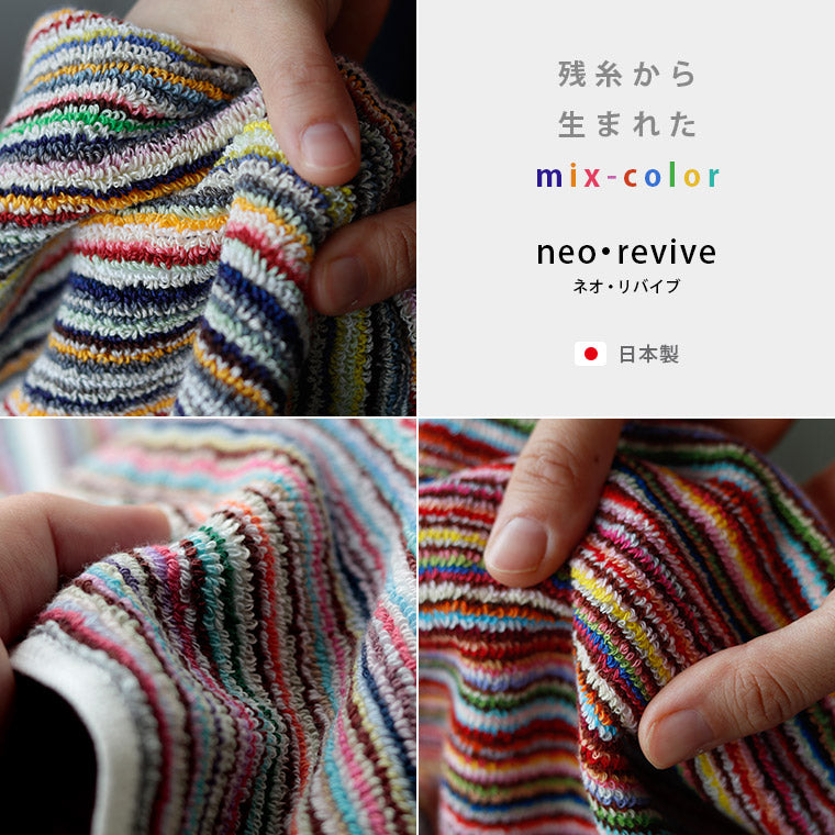 上質な残り糸だけを使用、環境にやさしい自然派タオルを復刻した“neo・Revive(ネオ・リバイブ)”。色色ミックスで楽しく温かみのある1枚に。