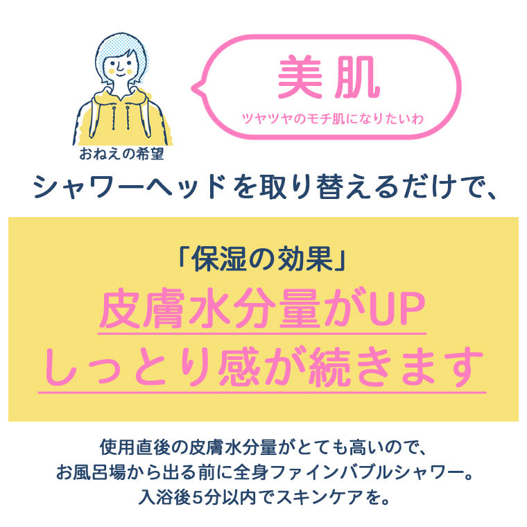 毛穴よりも小さい、微細な泡・マイクロナノバブル(マイクロファインバブル)を生成するシャワーヘッドです。 小さな泡を含むシャワーは水流を浴びるだけで、洗浄力をしっかりサポート。皮脂汚れを吸着し、しっかり洗い流します。 肌水分量がUPする(保湿効果)・肌表面温度がUPする(保温効果)という、ファインバブルの魅力はもちろん、このシャワーヘッドの更なる魅力は、何よりも強化されている「節水」です。 年間節約効果(ガス光熱費・水道代)は、シャワーヘッド代以上。更に、手元でストップできる一時止水機能付きなので、細かくシャワーを止めて、節約効果UPも期待できます。 浴び感は、水量をしっかり感じながらもバブルを浴びているようなソフトな肌触り。TKSの水制御技術により、ソフトなのに、水量を感じる心地よさを実現しています。 そして、なんといっても軽い。重量は約165g。ファインバブルのシャワーヘッドは300g前後が多い中、お子様から高齢の方まで取り扱いやすい重量で、家族全員が満足できるオールラウンダーのシャワーヘッドです。 ※ご利用のモニター環境により色味に差異が生じる場合がございます。 |