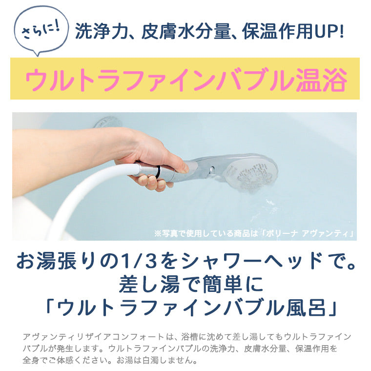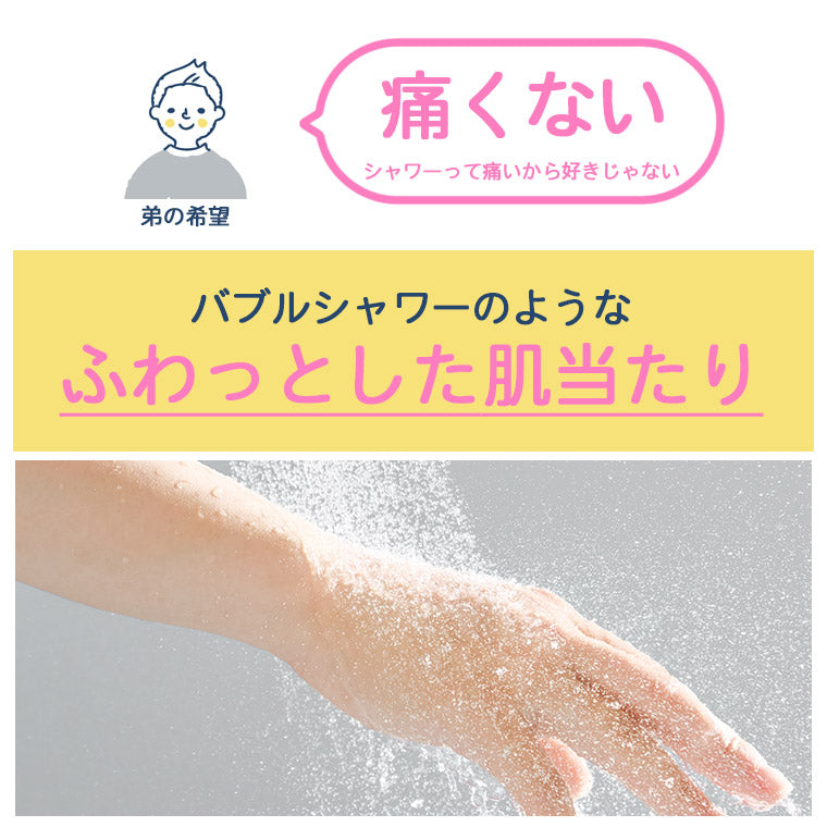 シャワー嫌いのお子様。理由のひとつに、シャワーの肌あたりが「痛い」勢いが「こわい」と感じていることがあります。アヴァンティリザイア コンフォートのシャワーは、ふわふわとしたバブル感のある肌当たりで、優しく洗い流します。