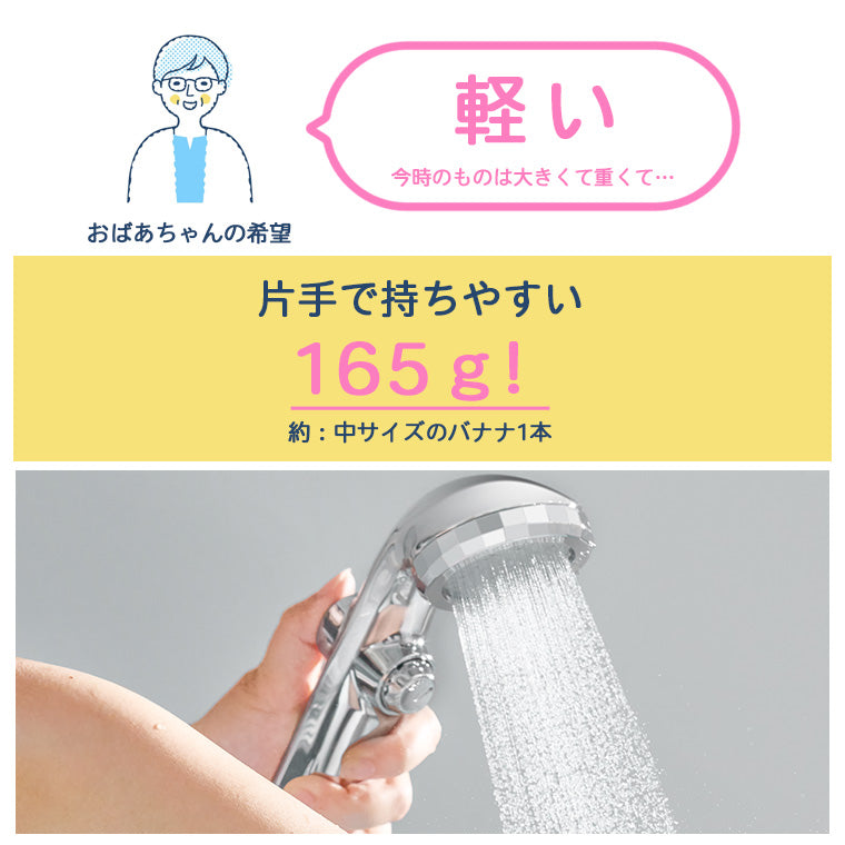 最近のシャワーヘッドは、水流が切り替えられる機能などもついて、大きく・重くなっている傾向があります。もちろん、よい部分はたくさんあるけれど、高齢の方やお子様には重く使いにくく感じることも。アヴァンティリザイア コンフォートは、重さ約165g。中サイズのバナナ1本位の重さです。大きすぎないヘッドにシンプルな機能。「みんなが使いやすいシャワーヘッド」です。