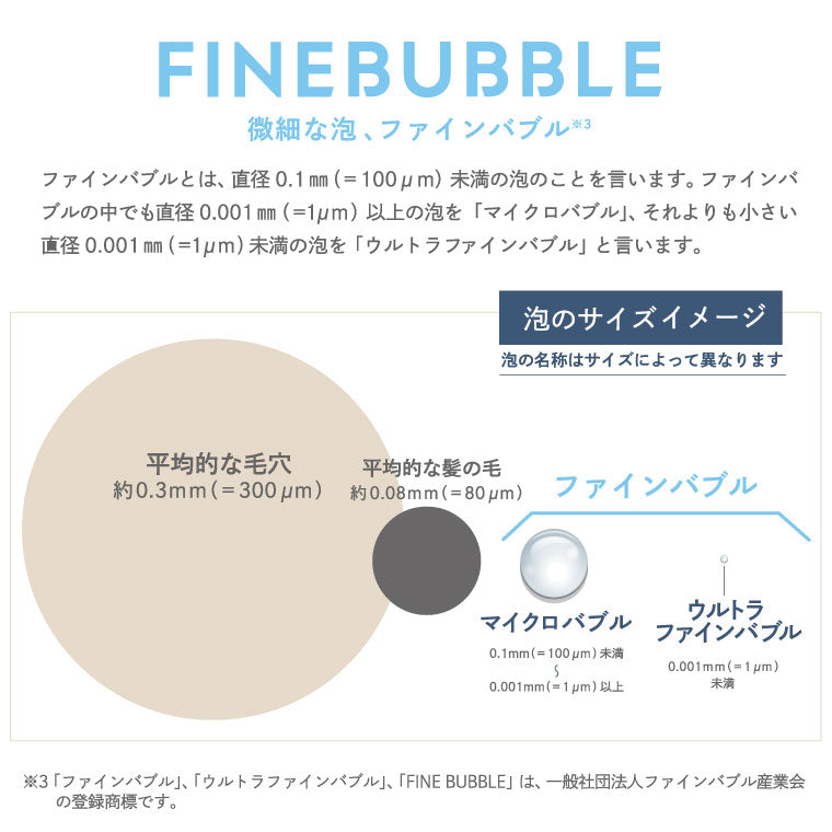 体臭の原因としてあげられる「汗」や「皮脂」。他にも原因はありますが、ファインバブルは「汗腺や毛穴の奥に詰まった皮脂や汚れを洗浄・除去」する効果が期待できます。ファインバブルは、平均的な毛穴・髪の毛よりも小さな泡です。アヴァンティリザイア コンフォートは、特許技術「μ-Jet(ミュージェット)」搭載。最小で0.0001mm(=0.1μm)の超微細気泡を作り出します。