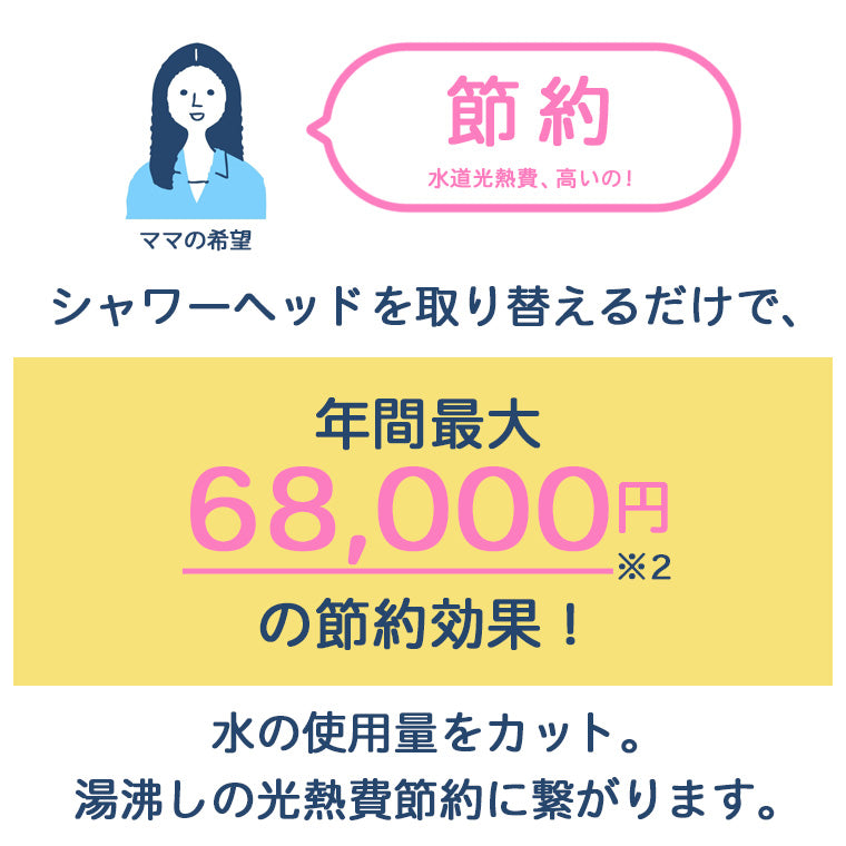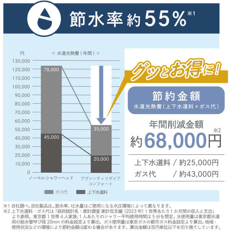 節水するシャワーヘッドは、上下水道代の節約だけでなく、お湯を沸かすガス代などの光熱費の節約にもなります。アヴァンティリザイア コンフォートは、節水率55%。年間削減金額は、なんと約68000円に!※2。シャワーヘッドの購入費を考えても、変えたほうが絶対お得!