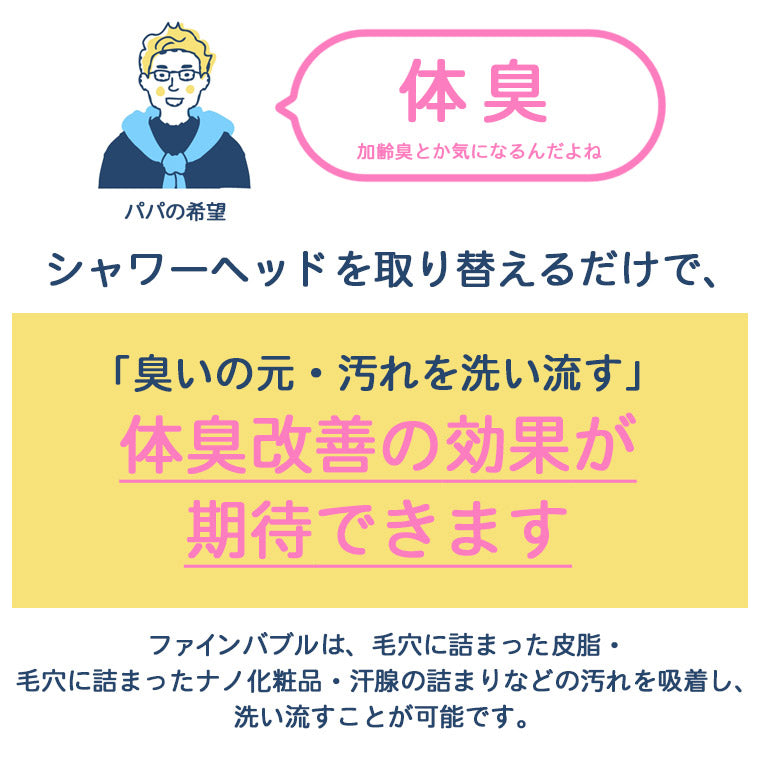 ファインバブルの効果(皮脂汚れを洗い流し、保湿・保温効果がある)で浴びるだけで、美髪ケアやスキンケア効果も期待できます。軽くて(165g)子供も高齢の方も使いやすい!